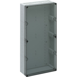 Empty enclosure, with attachment bushes, sealing and insulating plugs, base: polystyrene, grey similar to RAL 7035, cover: polycarbonate, transparent